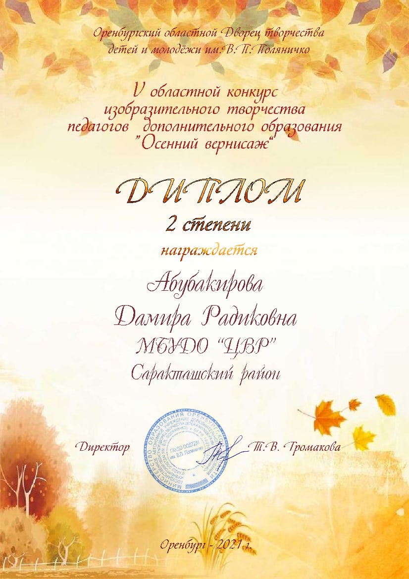 V Областной конкурс изобразительного творчества педагогов дополнительного образования "Осенний вернисаж" г. Оренбург 2021г. Диплом 2 степени