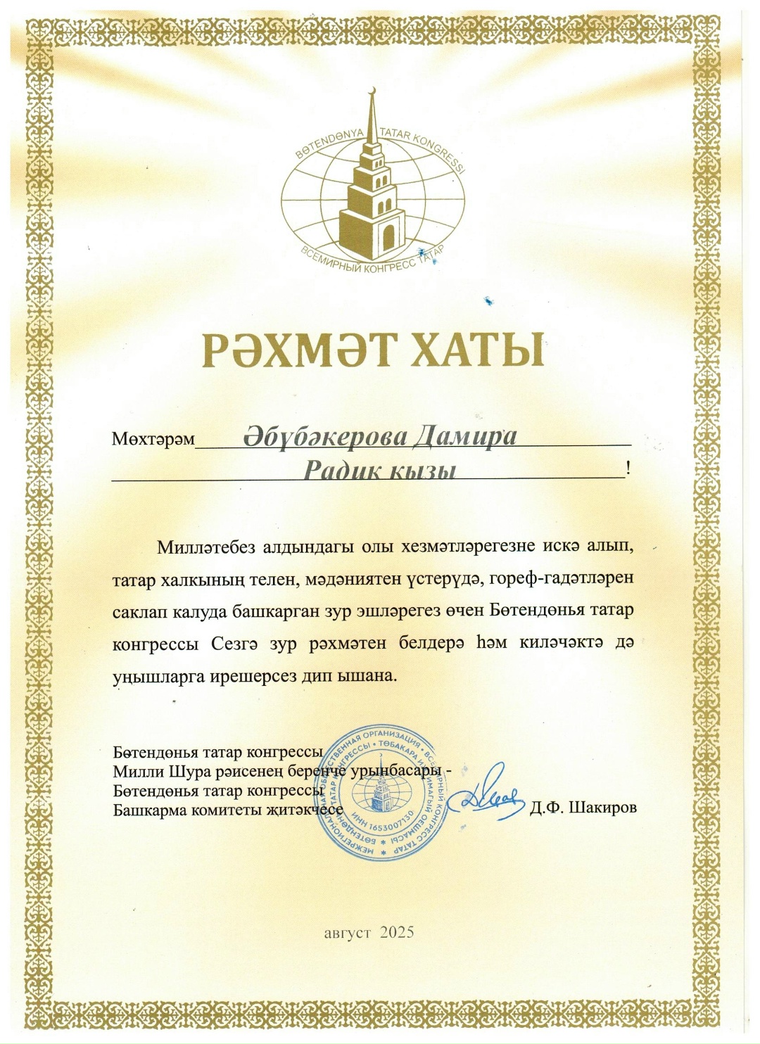 Благодарственное письмо !! Всероссийского Арт -симпозиума художников на фестивале - конкурсе татарских самодеятельных фольклорных ансамблей "Жырлыйк эле" в этнографическом музее "Бабай утары" Июль - август 2025 г.