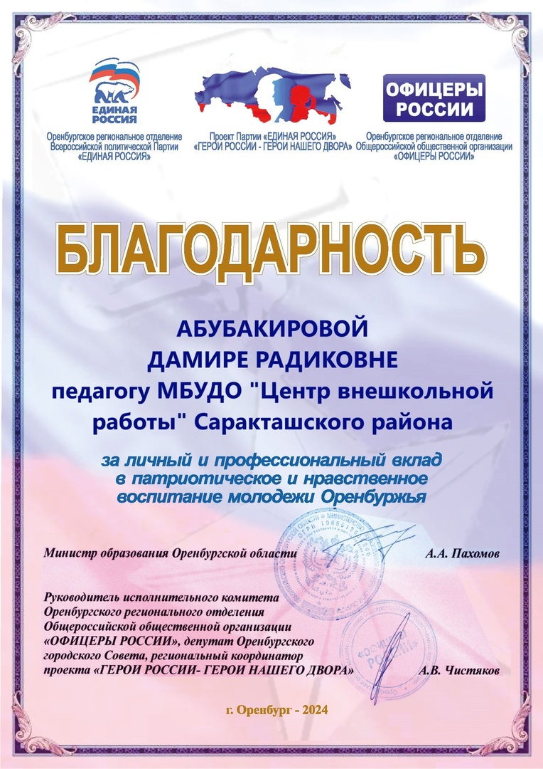 Благодарность за личный и профессиональный вклад в патриотическое и нравственное воспитание молодежи Оренбуржья Офицеры России г. Оренбург 2024г.