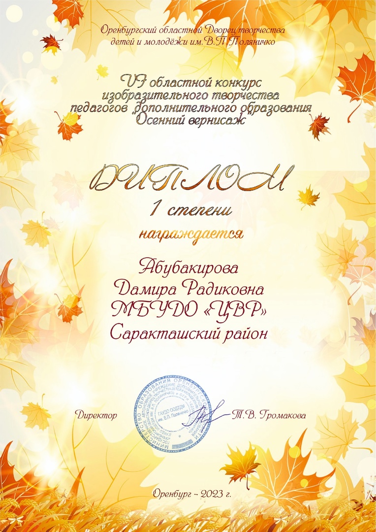 Областной конкурс изобразительного творчества "Осенний вернисаж" Диплом 1 место г. Оренбург 2023г.