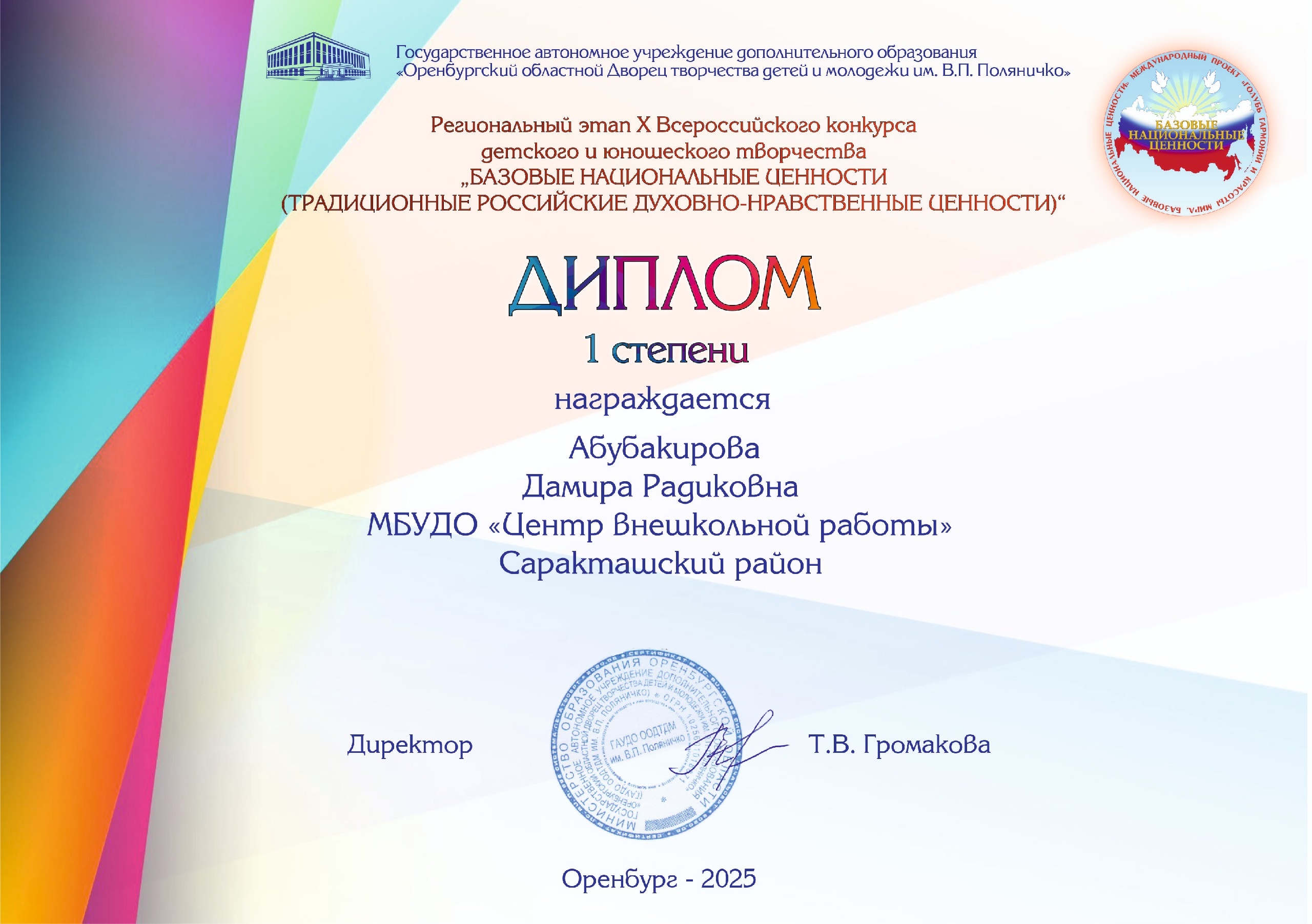 Региональный этап Х Всероссийского конкурса детского и юношеского творчества "Базовые национальные ценности" Диплом 1 место