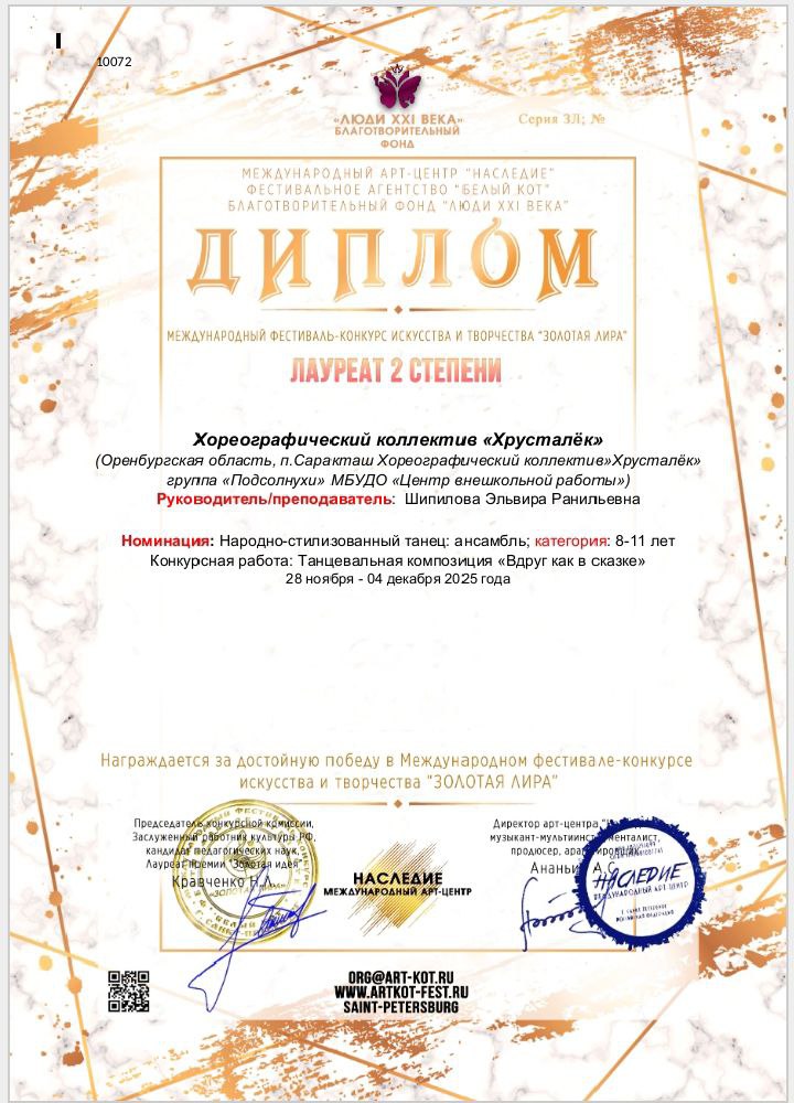 2025 год.Международный фестиваль искусств "Золотая Лира" Лауреат 2 степени.